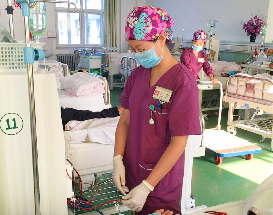 与以往单调的白大衣相比,新护士服在色彩上更加丰富。急诊科护士统一更换成墨绿色套装,让来院的急诊患者可以从众多的医务人员中更直观地识别急诊科护士,同时在外在形象上也能更好地表达急诊“绿色通道”的理念。普通科室采用蓝色印花分体式护士服,分体式护士服更便于护士进行各种操作,淡淡的蓝色印花看上去倍感温馨,给人清爽而又不失端庄的感觉,还对患者起到很好的安抚作用,尤其是害怕‘白大褂’的儿童,更加喜爱这款“小清新”的护士服。ICU、血液净化中心等特殊部门采用的是酒红色室内服,暖色调有效减轻了危重病人的恐惧心理,为患者营造了和谐、温馨的人文环境。