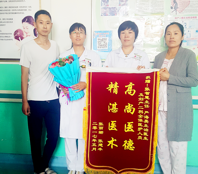 患者二胎孕8个月,确诊为完全性凶险性前置胎盘、胎盘植入,出于对我院妇产科医护人员的信任,选择在我院实施剖宫产。前置胎盘+胎盘植入十分凶险,在妊娠晚期或产后常并发大出血,导致切除子宫,危及母婴生命。面对患者诚挚的目光、渴望的眼神和复杂的病情,产科医护人员在张智慧主任的带领下,组织全院相关科室进行术前讨论,制定了详细周密的手术及抢救预案,将手术必要性、手术方式、术中、术后可能发生的意外和并发症充分告知患者及家属,并对手术中可能出现的意外制定了具体的防范措施。一切准备就绪后,手术如期进行,术中可见怒张的血管深深扎入子宫,胎盘剥离面出血汹涌,手术难度之大可想而知,术中出血约2600ml,科室立即启动应急预案,将术前备好的红细胞、血浆、冷沉淀及时顺利输入。医护人员争分夺秒的抢救创造了生命的奇迹,母婴平安,并为患者保住了子宫。术后,在产科医疗团队妥善的治疗和护理下,患者成功度过难关,无并发症发生。患者和家属对医院和医护人员深表感谢,并送上锦旗称道:"是你们挽救了我们母子的性命,你们就是我的亲人!"
