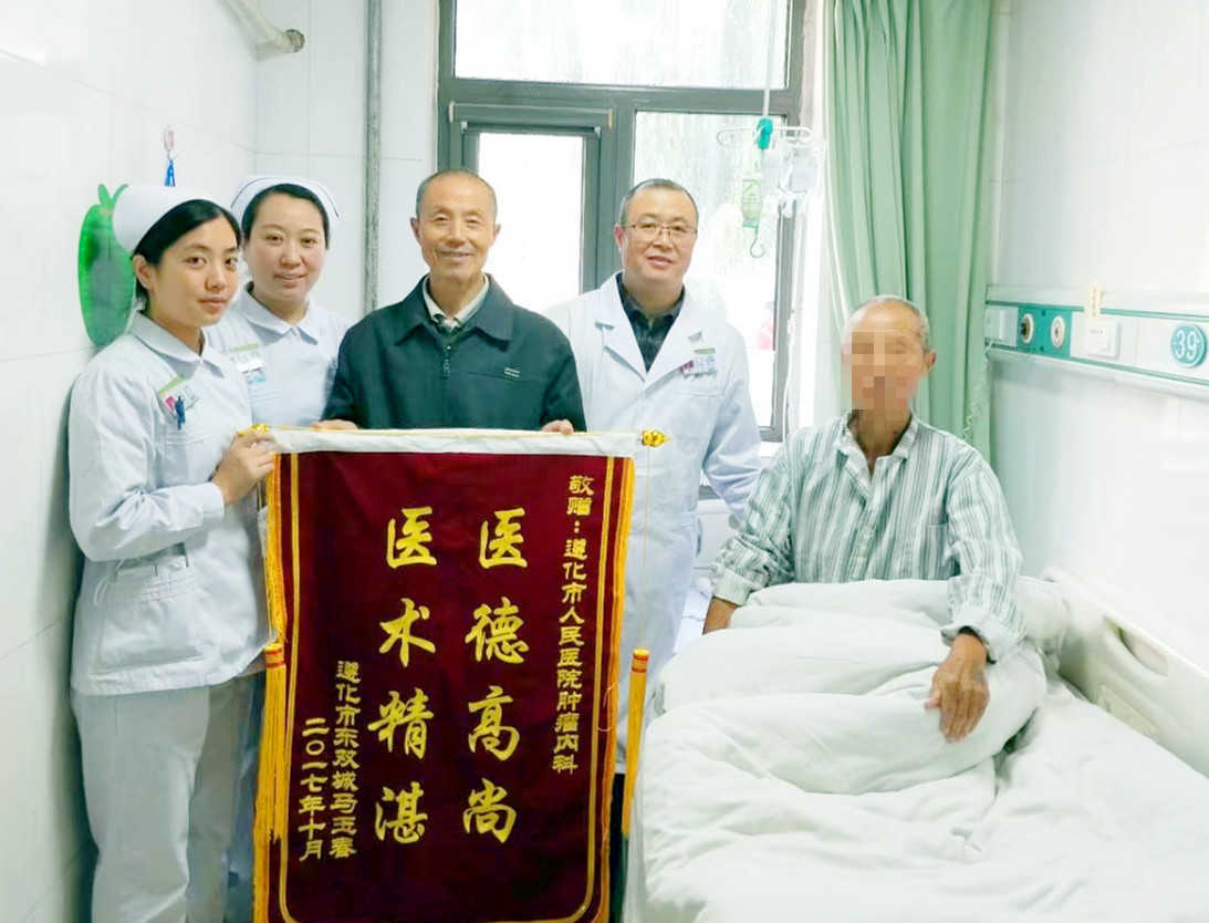 患者为食管中下段鳞癌,已92岁高龄,进行性吞咽困难,流食都出现哽噎,且有冠状动脉硬化性心脏病、劳力+自发型心绞痛、高血压病3级(极高危)等基础病,病情复杂、手术风险极高。看着患者饱受病痛折磨,肿瘤内科积极邀请多学科会诊,并和家属进行商议,最终在介入科的大力协助与支持下,成功为患者置入食管粒子支架。