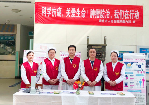 在市区钟楼,肿瘤内科医护人员为来往的广大市民普及相关防癌抗癌医学知识,前来义诊询问的市民络绎不绝,当天共义诊280余人,测血压120余人,发放防癌抗癌科普宣传资料500余份。