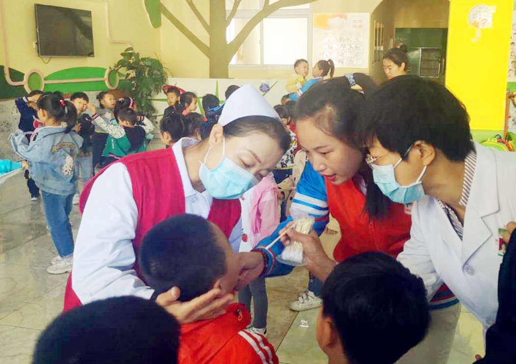 活动中,桃李社区门诊部的医生与幼儿园老师一同给孩子们做晨检,认真检查幼儿手、口有无异常,仔细询问幼儿在家的活动与身体情况,并就手足口病的发病症状、预防措