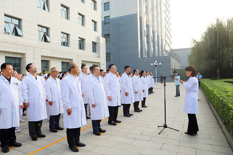 随后党总支书记、院长张晓军发表讲话,他表示,今年是新中国成立70周年,也是医院建院70周年。70年沧桑巨变,医院的成长与祖国的命运心脉相连;70年风雨兼程,历经了数代遵医人的上下求索;70年奋进岁月,留下了遵医人奋勇拼搏的足迹;70年同舟同济,见证了遵医人初心不变的坚守!遵医人用大爱无疆的医者初心在建院征程上留下了艰苦创业、辛勤耕耘、勇敢睿智的印记;以救死扶伤的职业使命刻画出责任、敬业、创新、和谐的遵医精神。希望全体干部职工要以祖国的70华诞和建院70周年为新的起点,不忘初心、牢记使命,按照“守初心、担使命、找差距、抓落实”的总要求,以刀刃向内的自我革命精神不断完善自我,努力把对祖国的热爱、对人民的忠诚和对生命的敬畏,转化到实际工作中,坚持“常见病做精、急危重症做优、疑难杂症做好”的发展定位,坚持“调结构、强内涵、增效益”,努力实现在全国百强排名中稳中求进,实现由进三级到强三级的转变。