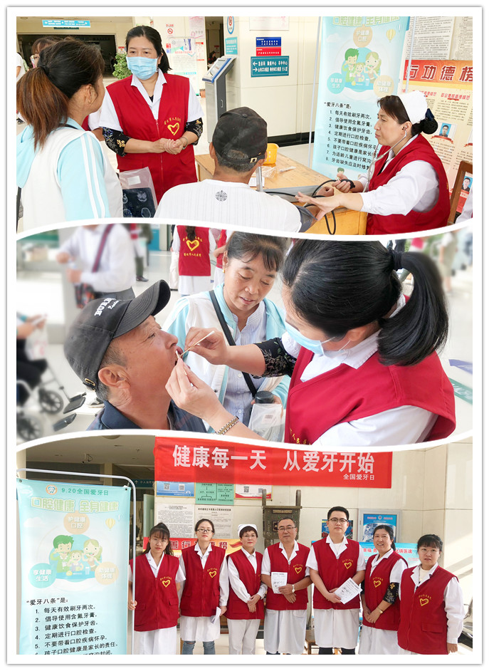 上午8点,口腔科医护人员在主任的带领下,向前来就诊的患者及过往群众宣传口腔健康的重要性、口腔健康与全身健康的重要关系,讲解牙周疾病的发生、发展、常见危害以及与心脑血管疾病、糖尿病的关系等相关知识,提供口腔健康检查,解答关于口腔疾病的相关咨询,发放口腔保健宣传资料。同时,医护人员还结合今年“9·20爱牙日”的主题告诉大家刷牙漱口和洁牙护龈的重要性,并讲解如何使用牙线。据统计,此次活动共发放健康手册100余份,义务测量血压和口腔检查80余人,受到了现场群众及患者一致好评。让我们一起行动起来,爱牙、护牙!人人拥有一口洁白健康的牙齿,绽放自信美丽的笑容。