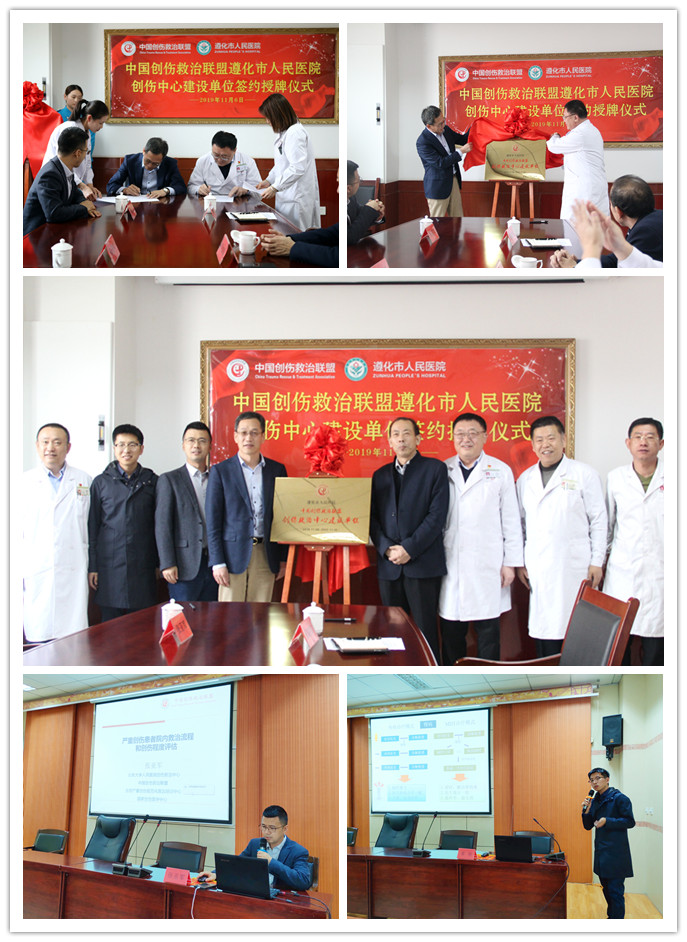 2019年11月6日,中国创伤救治联盟·遵化市人民医院创伤救治中心建设单位签约授牌启动仪式暨学术讲座在我院成功举行。北京急救中心科教办主任、中国创伤救治联盟副秘书长张进军,中国创伤救治联盟秘书张亚军,北京大学人民医院创伤救治中心医师李明,遵化市副市长李金良,我院院长张晓军、副院长张中原出席了签约授牌仪式。来自医共体成员单位及各乡镇卫生院的创伤、重症、急救专业的同仁近100人参加了学术讲座。
