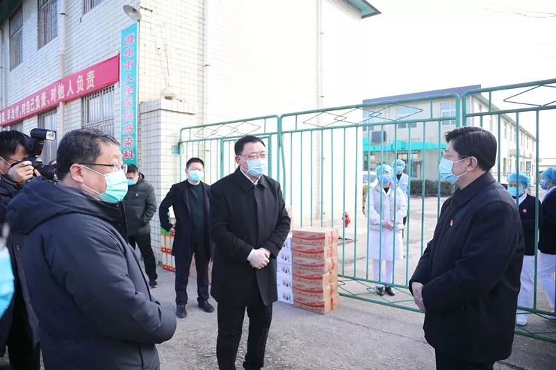 自新型冠状病毒肺炎疫情防控工作开展以来,遵化市委、市政府领导多次来到我院预检门诊、发热门诊、感染性疾病科等疫情防控一线进行调研,了解一线工作人员在防疫、抗疫过程中有什么困难需要解决,指导医院科学防治,精准施策,让广大医务工作者备受鼓舞。2月16日上午,遵化市委书记董学忠、市长王凤海等领导,又专程来到我院新冠肺炎隔离病房,走访慰问战斗在抗疫一线的医护人员并送上慰问品。