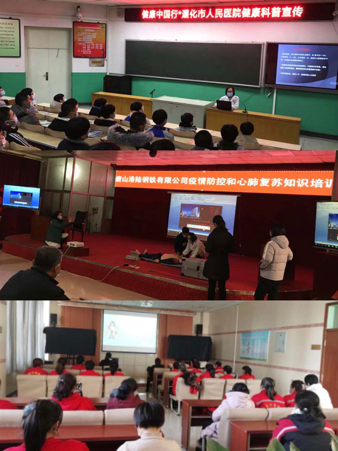 按照遵化市人民政府关于印发《开展健康中国·遵化行动实施方案》的通知要求,为进一步做好健康科普传播工作,不断提升健康传播能力,全面提升我市城乡居民健康素养水平,助力我市全国卫生城市创建工作,我院结合医院医疗救助中心,于2020年12月13-15日由副院长杨晓利带队,深入遵化市一中、港陆钢铁厂、遵化华夏中青家政服务公司、遵化市城市管理局,针对不同群体组织开展了四场急救知识以及新冠肺炎防护常识培训。