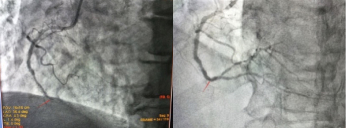 丁大爷入院后,心内科一病区医生对其进行了详细的病情评估,初步诊断为“急性非ST段抬高型心肌梗死”,在征得患者及家属同意后,于10月27日为丁大爷行冠脉造影检查,结果显示:前降支近中段节段性偏心狭窄最重60%,回旋支细小,血流通畅,均达TIMI3级;但右冠脉远段支架内闭塞,血流TIMI0级。心内科介入团队面对患者冠心病诊断明确,曾行支架植入治疗,现反复心绞痛发作,造影提示支架内完全闭塞,且管腔细,即使再次植入小直径支架,仍然增加再狭窄几率,且患者高龄,再次支架植入需更强的抗血小板方案,疗程至少1年,增加出血事件几率等情况,经反复讨论,最终考虑使用药物球囊扩张治疗,使闭塞段血管恢复有效管腔面积和正常血流,并减少再狭窄几率,既达到治疗目的,同时又可以缩短双联抗血小板时间,在一定程度上降低出血事件发生率。经过和患者及家属的充分沟通,患方接受此种治疗方案,并积极配合治疗。手术由心内一病区主任冯天保、主诊医师李文辉共同完成,右冠开通后经过充分预处理,后送入2.5mm*30mm药物球囊扩张30s,复查冠脉造影右冠管腔恢复,血流恢复正常,手术过程顺利,患者无不适主诉。