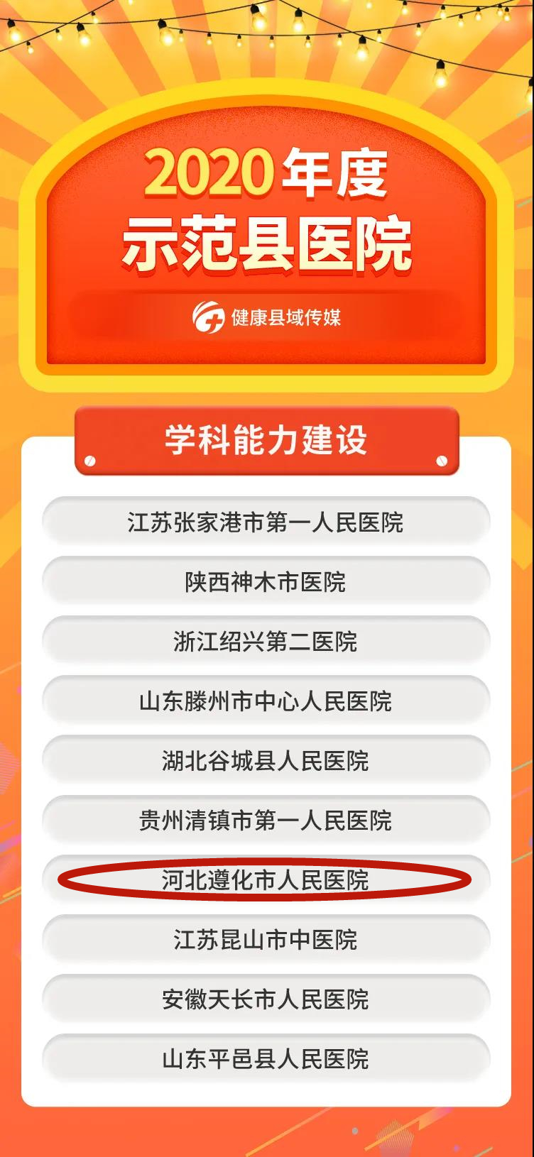 2021年2月17日,在《健康县域传媒》发布的“学科能力建设”2020年度全国示范县医院榜单中,我院作为河北省唯一入选医院位列其中。