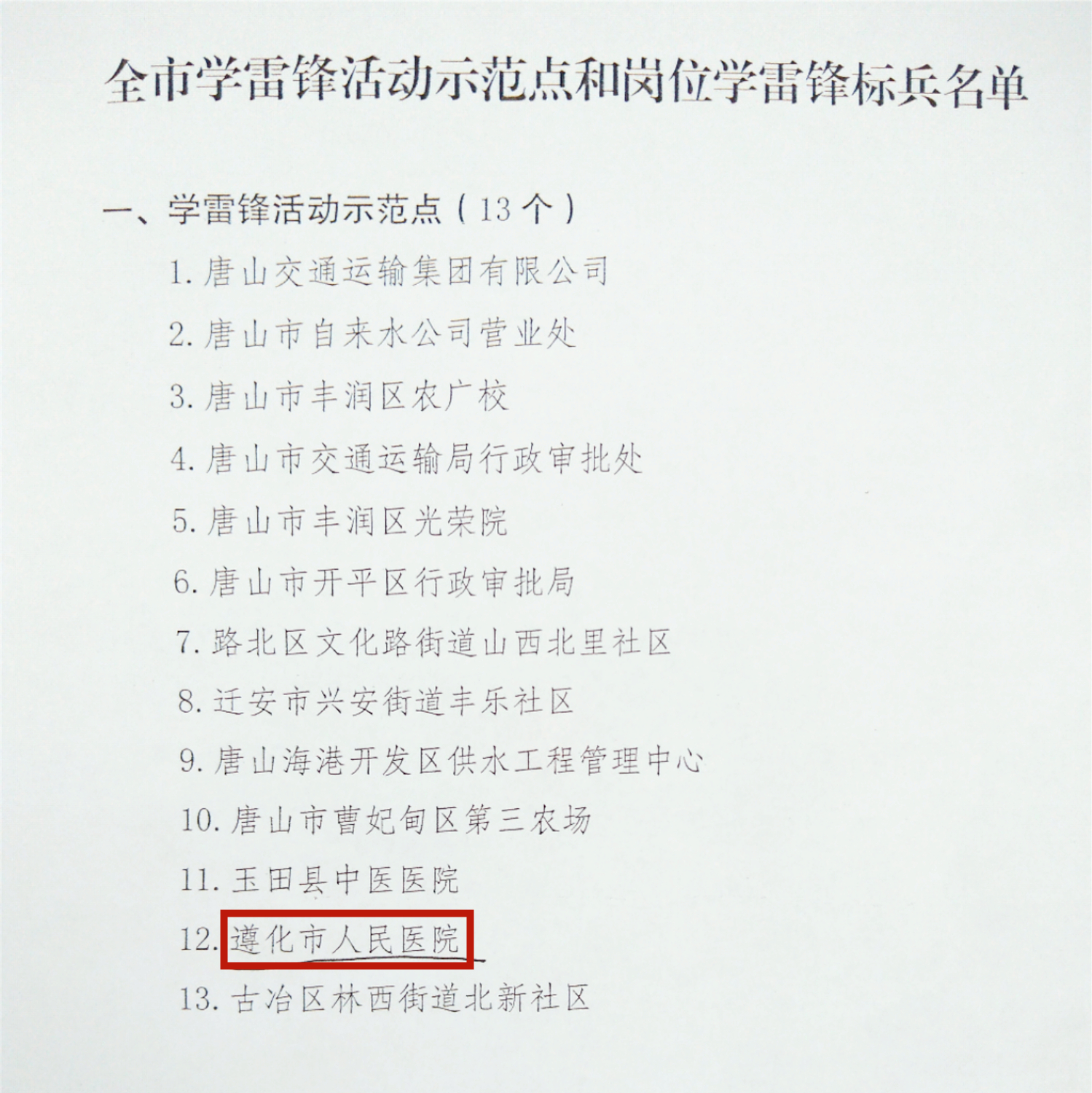 为进一步推动学雷锋活动深入开展,2021年3月11日,唐山市委宣传部下发《关于确定唐山市学雷锋活动示范点和岗位学雷锋标兵的决定》。遵化市人民医院作为传承雷锋精神、践行社会主义核心价值观的突出代表,成为全唐山市13个学雷锋活动示范点之一。