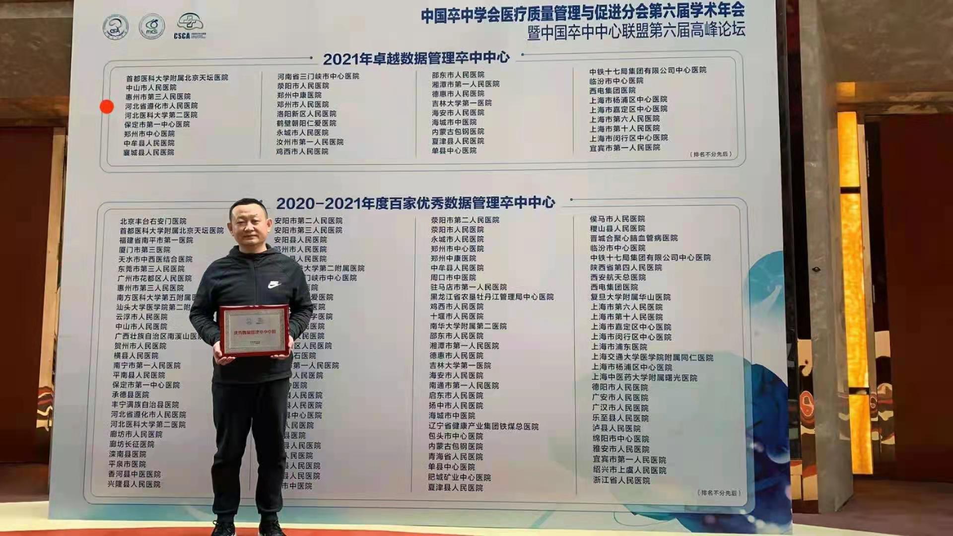 2021年4月10日,中国卒中学会医疗质量管理与促进分会第六届学术年会暨中国卒中中心联盟第六届高峰论坛在北京召开。会上,全国36家医院被授予2020-2021年度“全国百家优秀数据管理卒中中心”及“全国卓越数据管理卒中中心”荣誉称号,我院作为河北省三家医院之一被授予奖牌,这也是我院第三次获此殊荣。两项荣誉的取得,是对我院卒中中心诊疗质量和数量的充分肯定与认可,标志着我院神经系统疾病医疗质量控制与管理处于全国先进行列。