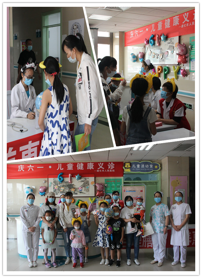 儿科门诊彩球高挂,喜气洋洋,护士长王小兵带领护士姐妹们早早布置好会场,还为来看诊的小朋友们送上精美的小礼物,祝他们节日快乐。诊室里,儿科主任高丽艳、眼科主任刘秀娥、营养科主任杨金萍,头戴气球发卡,组成了一支“可爱”的义诊团队,向家长们询问宝贝的身高、体重,检查营养和视力状况,并现场向家长们施教儿童视力、儿童青少年肥胖、儿童缺铁性贫血等那些常常被忽视的健康问题,普及健康知识。