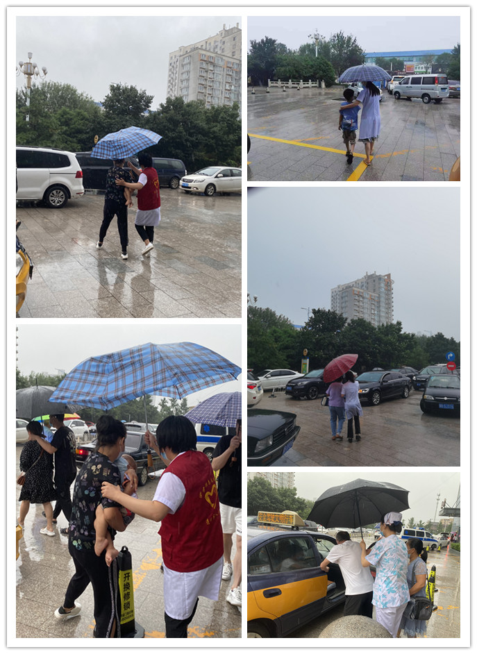 创城检查期间,连续两天暴雨骤至,因志愿服务台备的雨具数量有限,看完病没带雨具的患者和家属们只能滞留在门诊门口,望雨兴叹;来院看病的患者在门诊门口下车也极不方便。恶劣的天气丝毫没有阻挡志愿者们文明创建的脚步,志愿者们看到这种情况,不顾暴雨倾盆,立即带上自己的雨具,义无反顾地在风雨中来回穿梭,撑伞协助来院看病的患者和家属下车、护送门诊看完病和出院着急回家的人们上车、帮助住院患者家属送午餐、将无人陪护的老年患者送上出租车、为等候的老人提供板凳、为拄拐的患者送上轮椅……望着志愿者们湿透的白大衣和被雨水打湿的脸庞,患者和家属们特别感动,异口同声地说:“医院提供的服务太暖心了,我要给你们点一百二十个赞”,“为了护送我们你自己的衣服都湿透了,我要把你们提供服务的视频推送出去”。“我为人人,人人为我“的文明风尚带动、感染、影响着在场的每一个人,文明的种子悄然在每个人心中生根发芽!