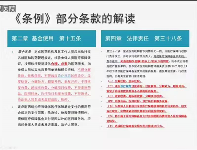 医保基金是人民群众的“看病钱”、“救命钱”,医保基金使用安全涉及广大群众的切身利益。此次培训,进一步强化了医务人员医保法制意识,营造了“人人知法、人人守法”的良好监管环境,使医务人员深刻理解条例的重要意义和严峻形势。我院作为定点医疗机构,将努力提高自身内部建设,坚决杜绝违法违规行为,并以维护基金安全为己任,依法依规为参保人员提供优质的医疗、医保服务,切实保障医保基金合理、规范、安全使用。