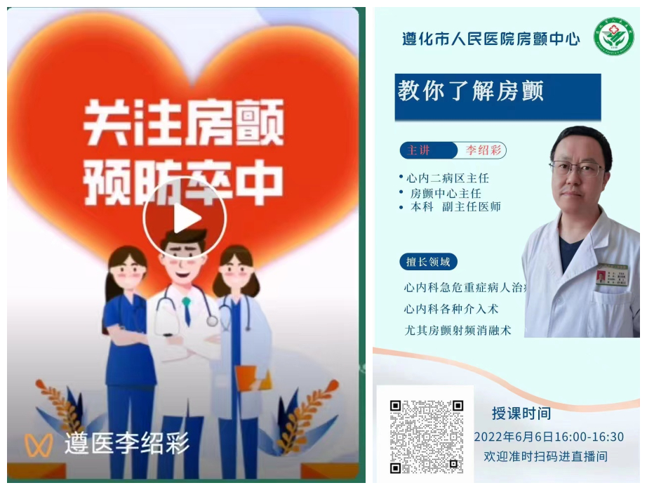 2022年6月6日,是第十个“中国房颤日”,今年的主题是“关注房颤,预防卒中”。为了进一步提高公众对房颤疾病的正确认识,减少卒中的发生,我院房颤中心录制并向公众推送了科普小视频;房颤中心副主任李绍彩也特别开展了《教你了解房颤》线上健康讲座,指导大家全面了解房颤的危害、房颤与卒中的关联和房颤脑卒中预兆,并规范就医。