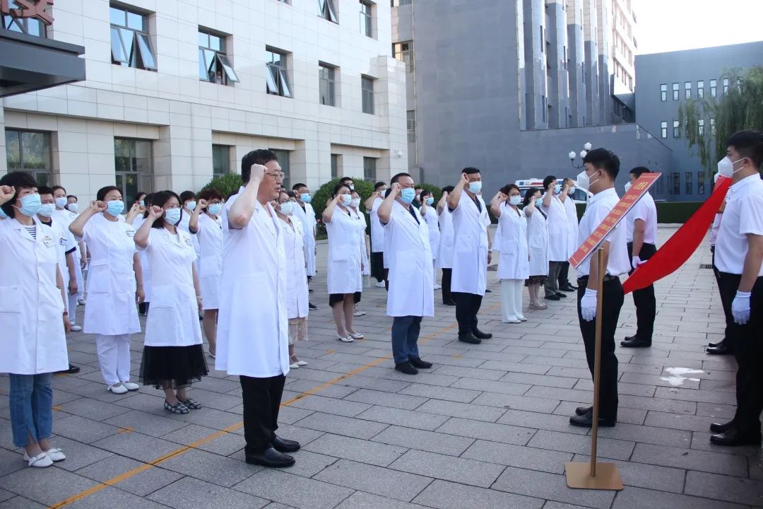 活动现场,100余名党员面向党旗,高举右拳,在党委书记张晓军的带领下庄严宣誓,“我志愿加入中国共产党,拥护党的纲领,遵守党的章程,履行党员义务……永不叛党!” 一句句铿锵有力的誓言,传递着党员们对组织的郑重承诺;一颗颗炽热而赤诚的拳拳初心,诠释着白衣战士生命至上、人民至上的坚定决心。誓言在朝阳中响彻广场,久久回荡。