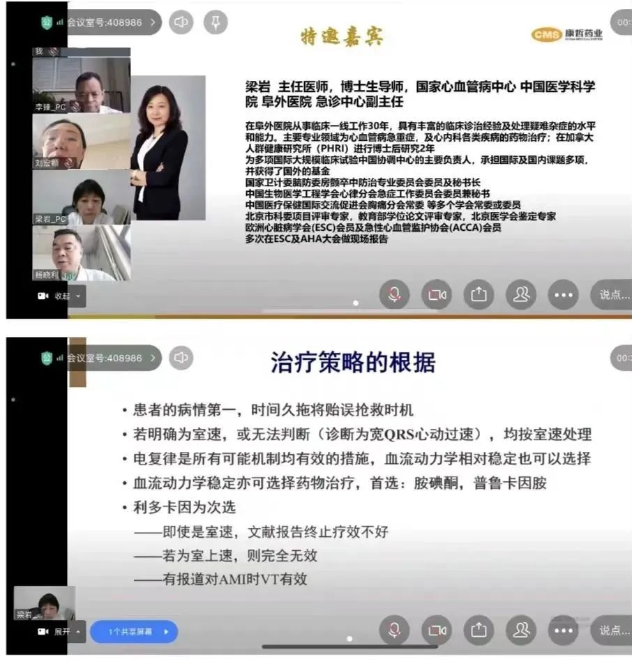 活动中,杨晓利副院长首先对梁教授在百忙之中参与线上交流表示衷心感谢,并对梁教授个人履历进行介绍。随后,梁教授结合临床实际病例,为与会人员深入讲解了“讨恶性心律失常病例引发的抗心律失常药物应用论”,同时对于终末期心衰合并恶性心律失常的患者在ICD、CRTD、射频消融及心脏移植等相关治疗方面如何选择?提出了规范化的建议;在病例讨论环节,梁教授对我院1例中年急性心肌梗死合并心衰急危重病例,从患者的发病过程、既往史、个人史、家族史、体格检查、辅助检查到治疗及转归等方面给予全面点评和指导,多维度、全方位、深层次的指导使大家受益匪浅。