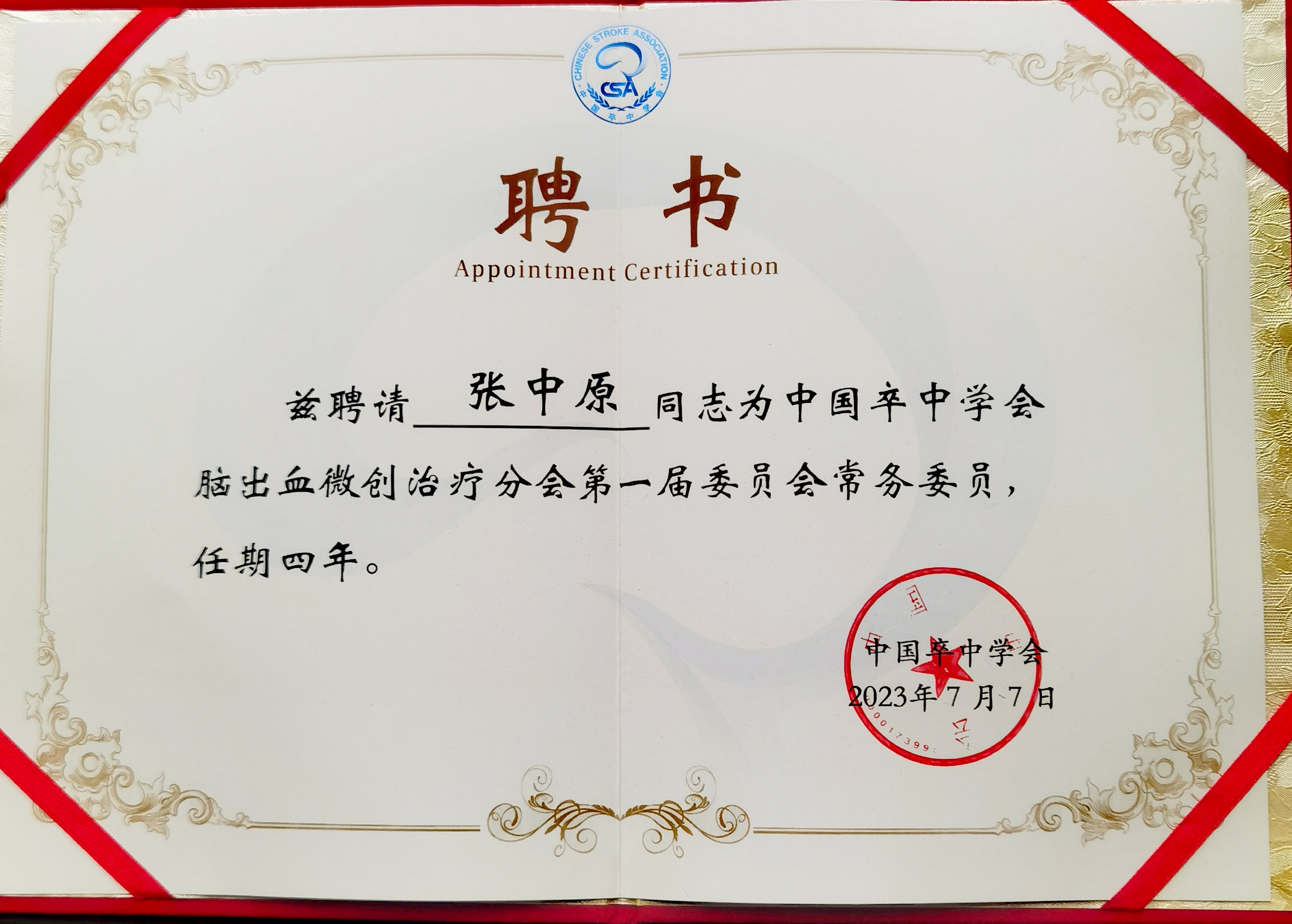 祝贺!我院院长张中原当选中国卒中学会脑出血微创治疗分会第一届委员会常务委员