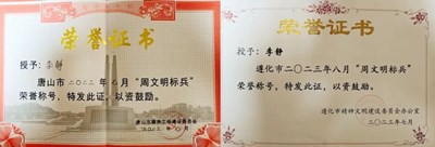 我院心内科副主任冯天保、重症医学科护士李静,分别荣获了“唐山市文明标兵”“遵化市周文明标兵”双项荣誉。