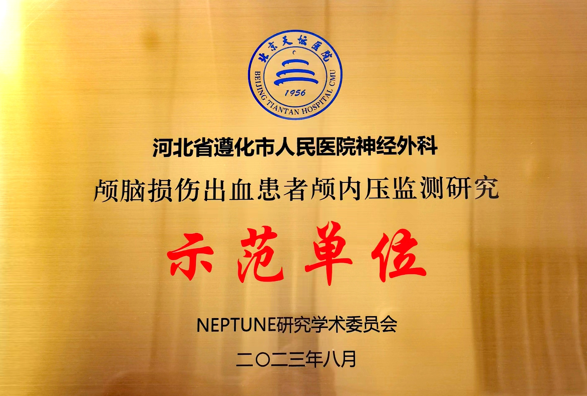 2023年9月10日,我院神经外科被北京天坛医院NEPTUNE研究学术委员会授予“颅脑损伤出血患者颅内压监测研究示范单位”。此“示范单位”的授予,既是对我院神经外科诊疗质量和数量的肯定,同时也是对我院神经重症救治方面的认可,标志着我院严重颅脑损伤治疗在全省乃至全国所处的位置。