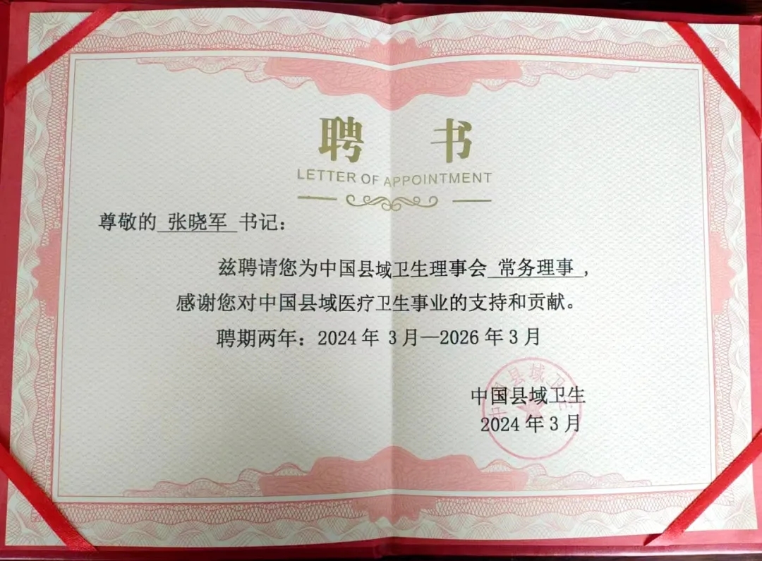 近日,中国县域卫生理事会为我院党委书记张晓军、副院长孟庆波颁发了“中国县域卫生理事会常务理事”聘书,并就两位院领导对中国县域卫生事业的支持和贡献表示感谢。