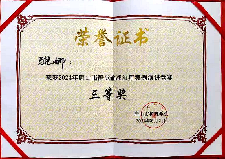 为推动静脉输液治疗领域的发展创新,进一步提高临床护理人员静脉输液治疗管理水平,提升静脉输液治疗质量。唐山市及河北省护理学会于2024年6月——7月,分别组织开展了“2024 年静脉输液治疗案例演讲竞赛”。我院选派的护理精英马艳娜在竞赛中凭借优异的个人表现,一路闯关、连战连捷,荣获市级和省级三等奖,为医院争得了荣誉。