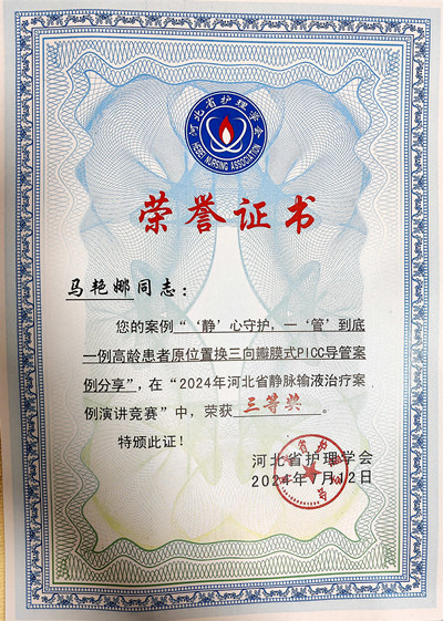 7月11日-12日,“2024年河北省静脉输液治疗案例演讲竞赛”在石家庄举行。马艳娜作为唐山市唯一一家县级医院的选手,以《“静”心守护,一管到底•1例高龄患者原位置换三向瓣膜式PICC导管》为题,围绕高龄且血管条件差患者PICC导管部分脱出体外这一护理临床问题,就采用循证方法探讨解决之道进行了精彩阐述。比赛中,她自信的仪态以及在静脉输液治疗方面的专业水平和优秀成果,给评委老师们留下了深刻印象,展示了遵医护理人的风采,再次荣获三等奖。