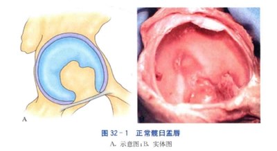 股骨髋臼撞击综合征是一组以髋关节周围解剖结构异常为特征的疾病,它因股骨近端和髋臼边缘间的撞击,会损害髋臼盂唇和相邻软骨,引起髋关节周围尤其是腹股沟区的慢性疼痛,导致髋关节活动范围受限。,尤其屈曲内旋和屈曲外展,长时间行走,久坐、久站、下蹲、抬腿时疼痛加重。此病好发于中青年爱好运动人群,是中青年髋关节疼痛最主要的原因,也是髋关节镜最常见的手术适应症。盂唇为髋臼边缘由关节软骨移行而出的纤维软骨组织,如图:
