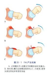 而在骨性结构异常突起时,反复频繁的撞击导致盂唇退变撕裂。髋臼股骨撞击综合征发生机制如图:
