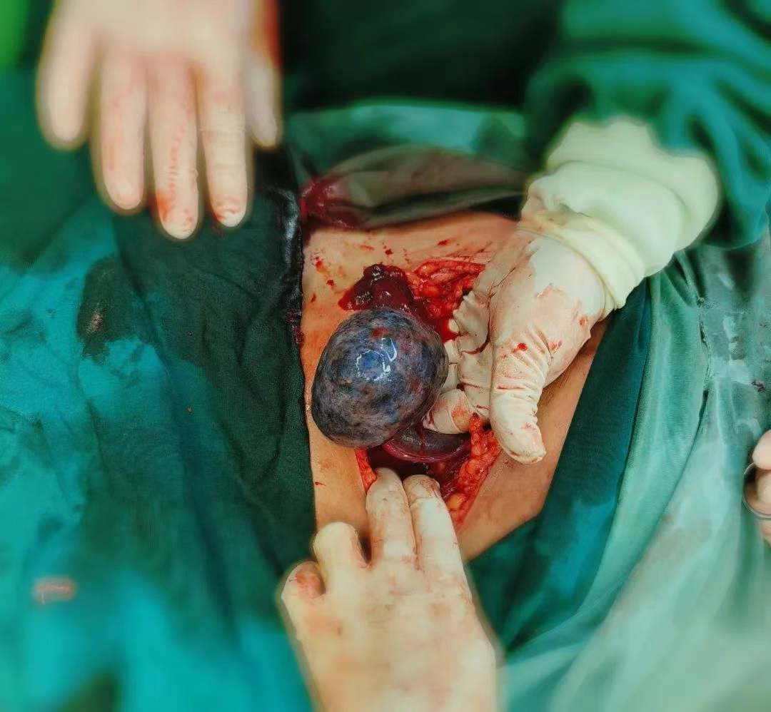 患者孕35周,因突发右下腹剧痛,被紧急送往我院就诊。经相关检查后确诊为右侧卵巢扭转。卵巢扭转本就是一种极其危险的妇科急症,若不及时处理,卵巢组织很可能因缺血而坏死,甚至危及生命,因此紧急手术刻不容缓。然而,该患者处于孕晚期,子宫体积显著增大,几乎占据了整个腹腔,极大地增加了救治难度。