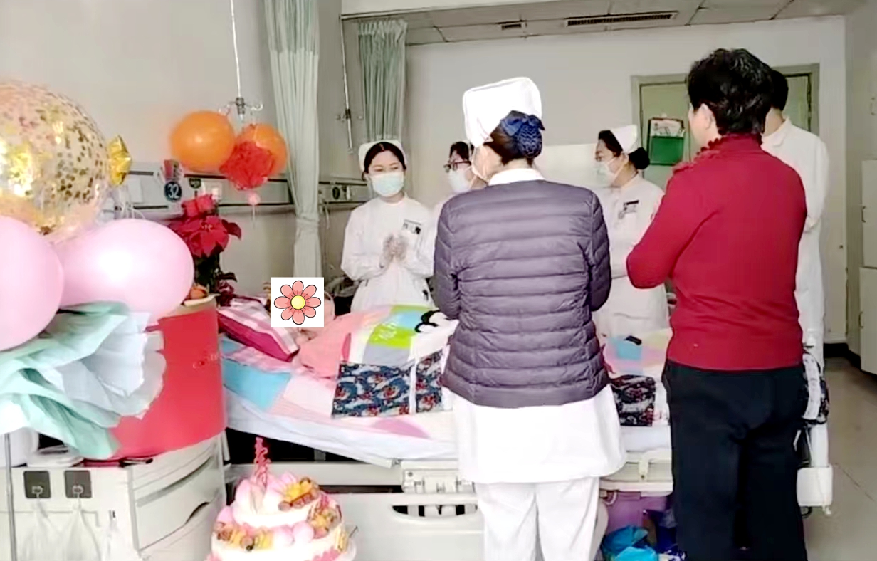 3月9日上午,科室医护团队悄然走进93岁患者的病房。他们用七彩的气球、喜庆的灯笼将病房布置一新,为老人营造出温馨的生日氛围。“奶奶,祝您生日快乐!”护士长端着定制的生日蛋糕和新鲜水果,为患者送上诚挚的祝福,并与家属一起共同为老人唱起生日歌。快乐的旋律,让原本安静的病房充满了欢声笑语。