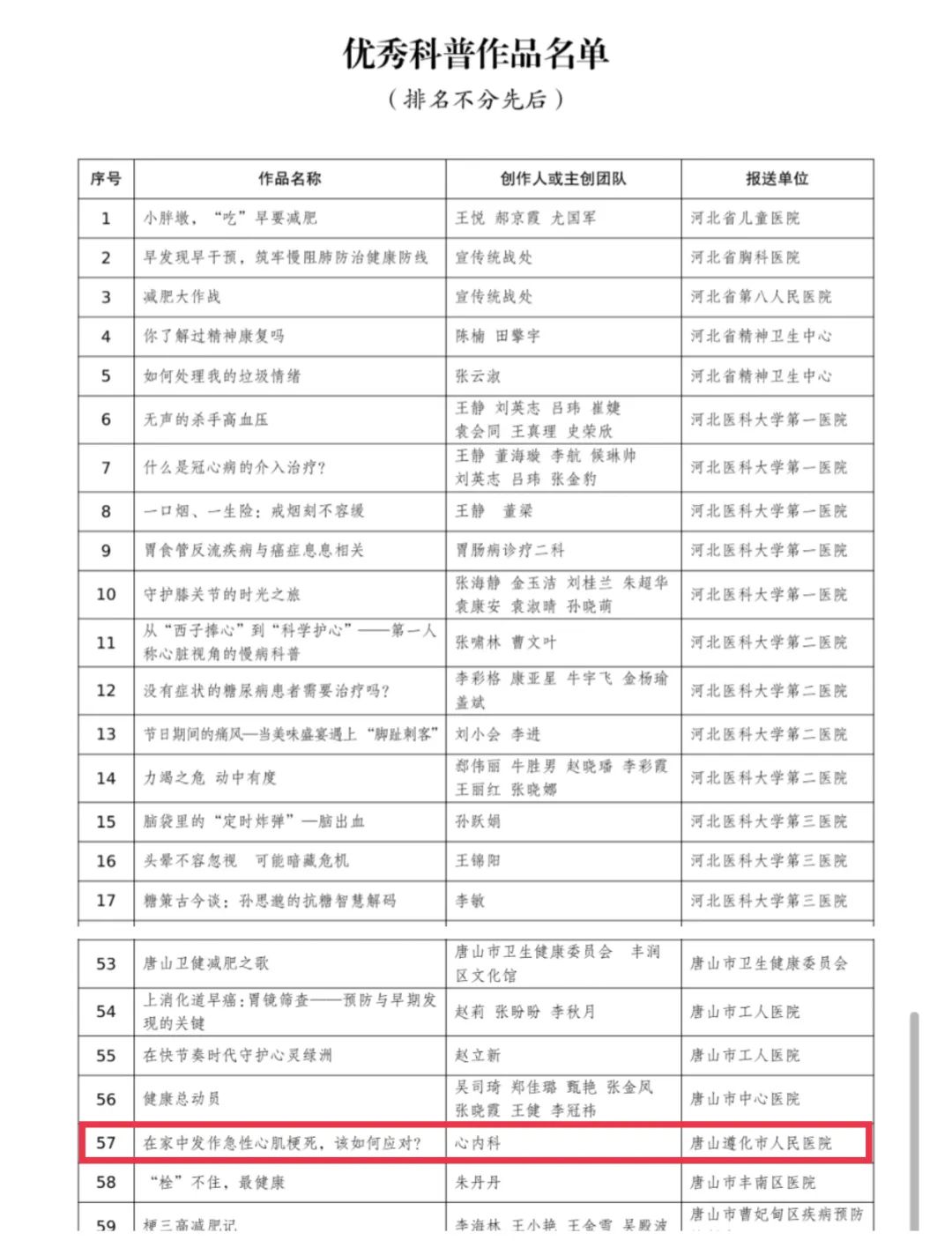 2025年5月23日,河北省卫生健康委“慢性病防治科普作品征集活动”结果揭晓,我院心血管内科报送的《在家中发作急性心肌梗死,该如何应对?》从全省908件作品中脱颖而出,成功入选优秀作品名单,以科学实用性和传播创新性获权威认可。