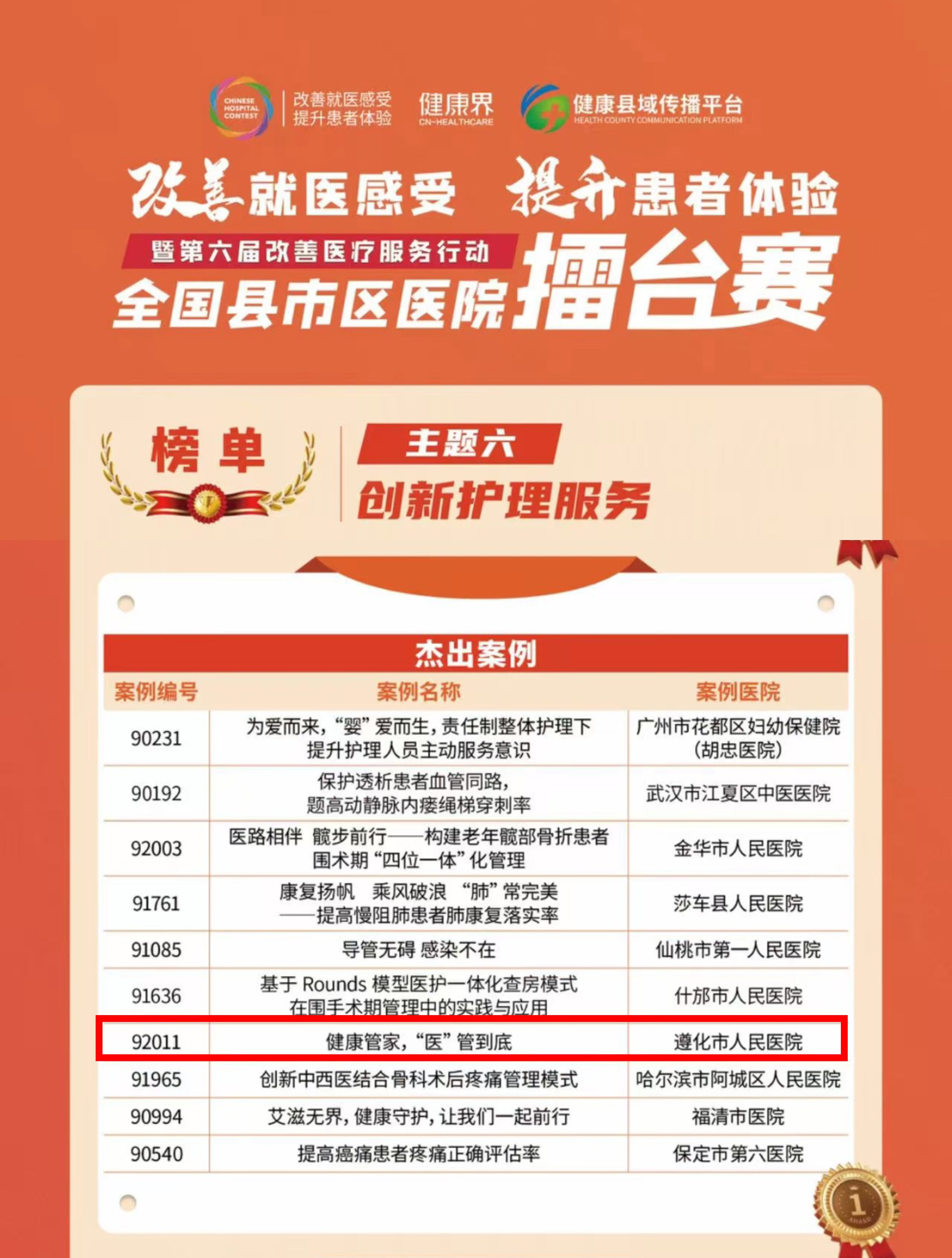 近日,由国家卫生健康委医政医管局指导,健康界、健康县域传媒联合主办的“‘改善就医感受,提升患者体验’暨第六届改善医疗服务全国县市医院擂台赛”揭晓获奖榜单。我院《健康管家,“医”管到底》案例凭借创新护理服务模式与显著实践成效,从全国众多优秀案例中脱颖而出,荣获“创新护理服务”版块杰出案例奖。
