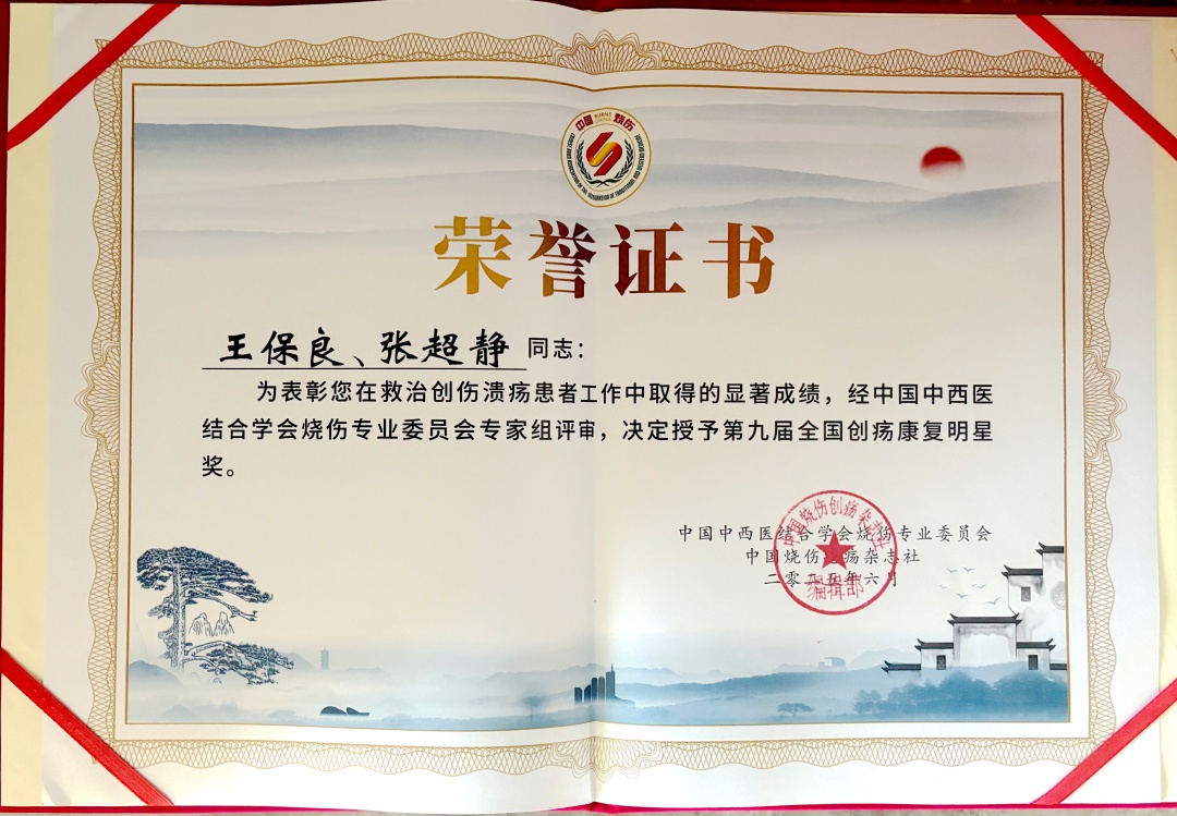 会议期间,大会评选并颁发了全国烧伤与创面修复领域的重磅奖项——“创疡康复明星奖”与“康复优秀奖”,吸引了全国300余例典型案例参赛。经过激烈角逐,我院烧伤外科王保良主任团队凭借高质量的选送病例,在众多竞争者中脱颖而出,荣获第九届全国“创疡康复明星奖”。