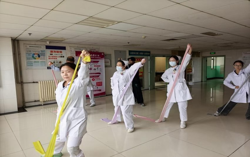 在我院心血管内科病区里,一场别开生面的心脏康复训练正在进行。患者们手持弹力带,在医护人员的专业指导下整齐地做着拉伸、扩胸等动作,这便是我院心血管内科为心脏疾病患者打造的特色心脏康复项目,旨在通过科学运动、健康管理,帮助患者重塑心脏功能,重拾生活信心。