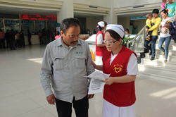 在门诊病人高峰期,口腔科专家来到活动现场,为来院就医的患者现场进行诊治并解答咨询,讲解了口腔健康是反映健康和生命质量的一面镜子,定期进行口腔健康检查,定期洗牙,就会远离口腔疾病。随后,志愿者们还发放了有关口腔健康的宣传资料。