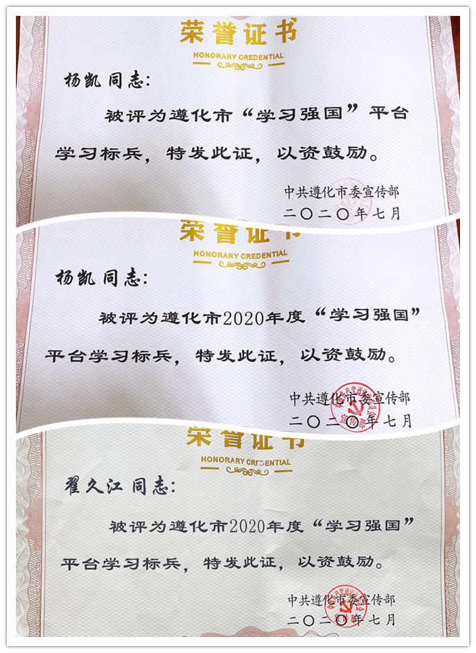近日,在遵化市委宣传部举办的2020年度“学习强国”推广使用表彰活动中,我院杨凯、翟久江,作为全市评选出的200名学习标兵受到表彰。其中,杨凯连续两年总积分在卫生系统排名第一,获得了本年度学习标兵及学习强国总标兵双重荣誉。